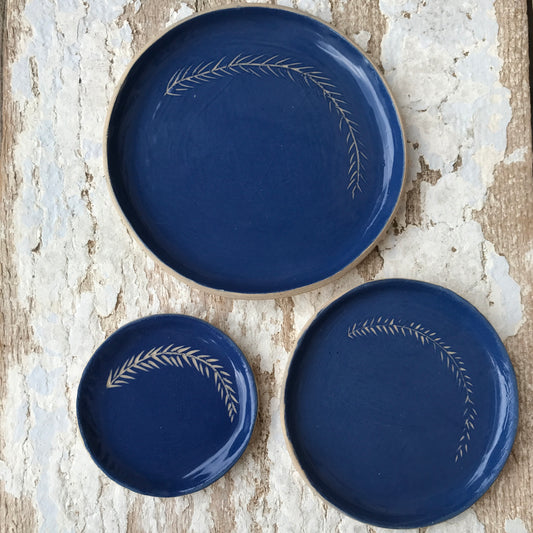 Botanical brights sgraffito ceramic side dish sets in Kingfisher blue, Parakeet green, Goldfinch yellow, Woodpecker teal.