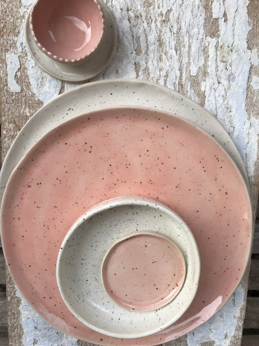 White, rhubarb and pearl pink long oval sgraffito ceramic side dish