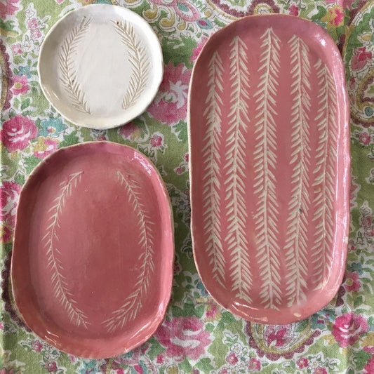 White, rhubarb and pearl pink long oval sgraffito ceramic side dish