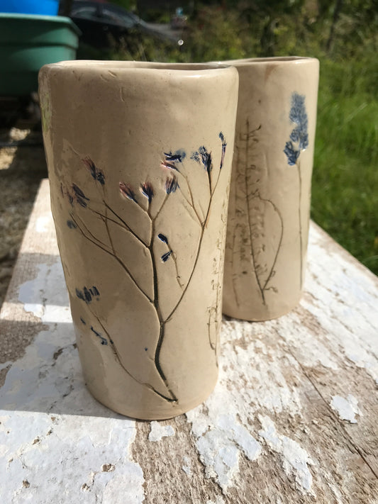 Natural stoneware glazed ceramic raised bowl with hand painted blue leaf garland floral design