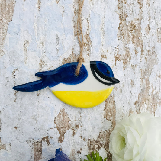 Porcelain Blue Tit and green Great Tit bird hanging decoration