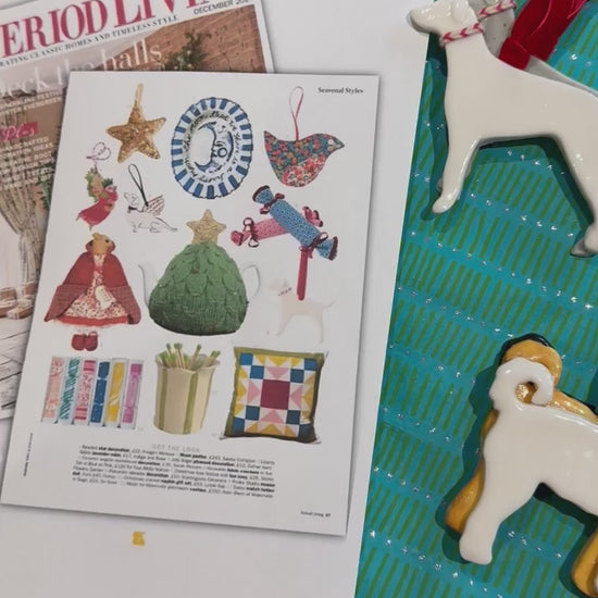 I make them from pure white porcelain clay from my little studio in Nailsworth. The pure white porcelain is clear or black glazed and offset with a luxurious velvet hanging ribbon.